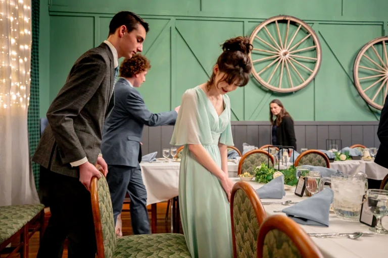 A formal sit down meal with adults and children in the banquet space of the Ovid Inn Event Center