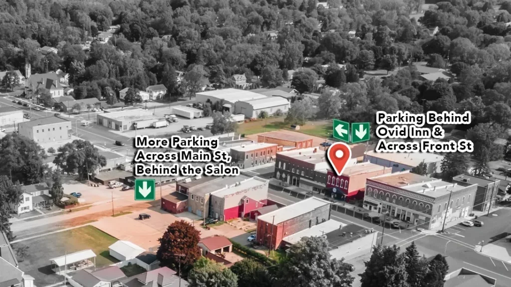 Main Street is bustling with many businesses that need parking on Main Street for their customers. This map shows Ovid Inn Event Center guest parking options, in the many large lots adjacent to the Inn!