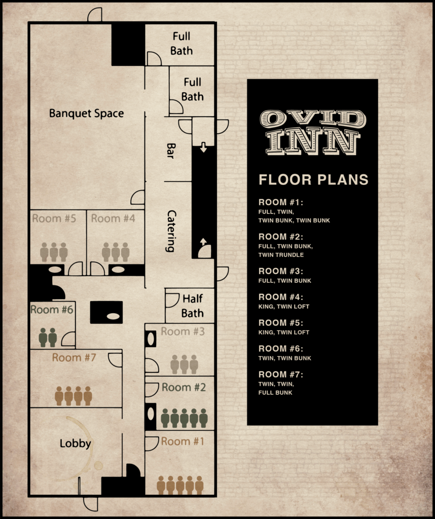 • Total Private Access to the Ovid Inn: $799 (7 Rooms, Up to 25 Guests)